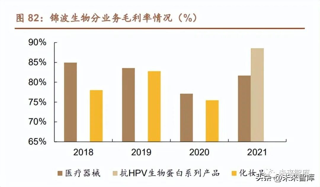 分業務角度:醫療器械營收貢獻及盈利能力提升明顯。2021 年醫療器械實現 收 入 1.63 億 /yoy+60.95% , 拉 動 公 司 整 體 增 長 , 醫 療 器 械 毛 利 率 為 81.69%/+3.35pcts,核心為重組人源膠原蛋白相關產品,三類的膠原蛋白纖維獲 證上市后獲得較好的認可,同時疫情催化醫療器械相關產品銷售。