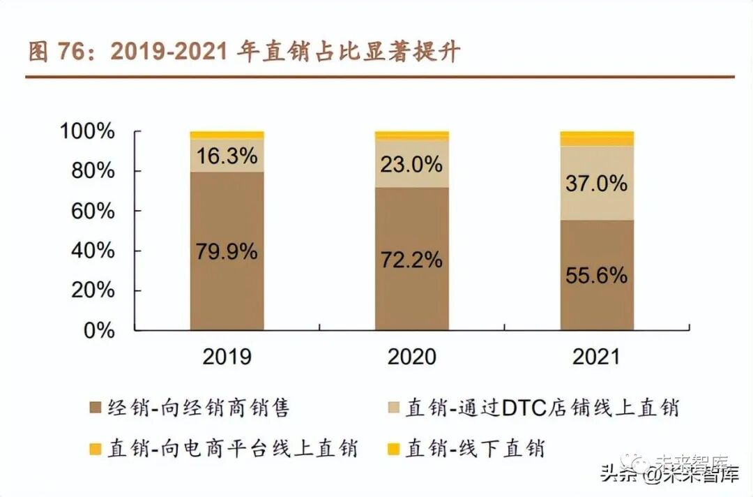 渠道端:以面向經銷商銷售為主,持續發力線上電商平臺,加大對線上直銷 渠道的建設。經銷商渠道收入占比從 2019 年的 79.9%降至 2021 年的 55.6%。公 司不斷開發線上直銷渠道,形成以 DTC 店鋪為主,電商平臺+線下直銷并存格局, 2019 年通過 DTC 店鋪(包括天貓、京東、抖音、小紅書、拼多多等平臺)的線 上直銷實現 1.56 億元的收入,占比 16.3%,至 2021 迅速增長至 5.74 億元,占比 37%;京東、唯品會等電商平臺表現亮眼。盈利能力方面,直銷渠道的毛利率基本 都高于向經銷商銷售的毛利率,而線上直銷渠道的毛利率均超過了 90%。