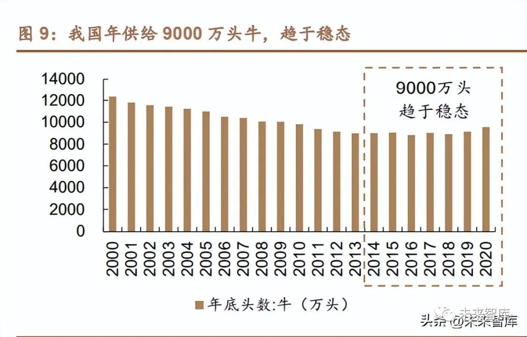 陸生動物儲備充足。創爾生物招股書披露,當前膠原蛋白的來源以牛類為主, 市場份額超過 1/3;海洋生物膠原蛋白占比逐年提升,以食品和化妝品領域應用 居多;而基因工程得到的膠原蛋白空間結構較天然膠原蛋白略有區別,產業化應 用仍在研究和拓展中。陸地動物方面,我國牛每年年底存量 9000 萬頭,趨于穩態,供給較為穩定;環保限制生豬養殖、規模化養殖導致散戶退出疊加非洲豬瘟 等因素影響,2019 年及 2020 年迎來超級豬周期,生豬存欄量達近十年低點, 2020 年底存欄量達 4.07 億頭,已基本恢復至豬周期之前水平,供給端逐漸恢復。水產品領域的產量逐年提升,2020 年產量達 6545 萬噸,保障膠原蛋白來源供給。實際可作為膠原蛋白的原料供給受限,未來或向水產及基因工程拓展。理論 上通過動物源生產的原料供給較為充足,而從實際的生產流程來看,天然膠原生 產的原料需按藥品管理規范進行管理,要求可溯源,對于陸生動物需要有出生至 屠宰期間的全部飼養記錄及用藥記錄,而國內滿足該要求的原料供應商較少,整 體而言面臨著原材料受限,難以大規模生產的問題。供給受限影響應用領域端的 拓展,同時也有材料高昂等問題,未來技術進步或推動基因工程領域的拓展,有 效解決原料受限問題。