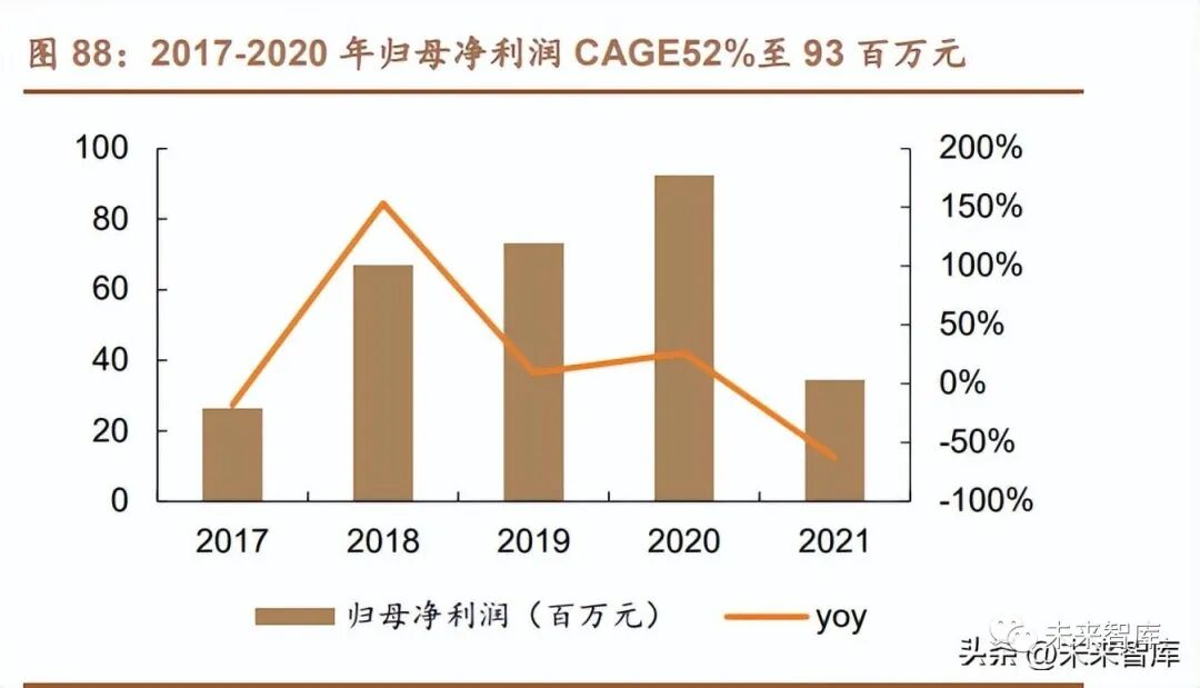 從醫療器械到護膚品,打造 2X2 產品矩陣。公司產品按是否含有膠原蛋白及 是否為醫療器械為標準,可劃分為 2X2 產品矩陣:1)從產品成分看,公司聚焦 活性膠原,同時涉足以水楊酸、透明質酸等成分為代表的非膠原產品打造;2)從 產品類別看,公司以醫療器械產品起家,現以“創福康”“創爾美”品牌為依托,聚焦 醫療器械、護膚品兩大業務,并在主業外打造“healosophy 壁然美”品牌布局保健 食品領域、圍繞基因編輯技術布局精準醫療領域,初探多元經營。營業收入、歸母凈利潤高增,業績可圈可點。2016 年國內首款Ⅲ類膠原貼敷 料獲批,次年國內化妝品紅利期來襲,佐以輕醫美市場帶動術后愈合市場擴容, 公司自 2017 年起進入高速發展階段。2020 年及 2021 年收入規模受到疫情擾動 及營銷宣傳不及預期,其中膠原產品為收入主要來源,自 2017 起貢獻 85%+營 收,非膠原產品占比逐年提升,2020 年達 14%;2021 年歸母凈利潤下滑,來自 收入規模下滑及營銷費用增加導致。