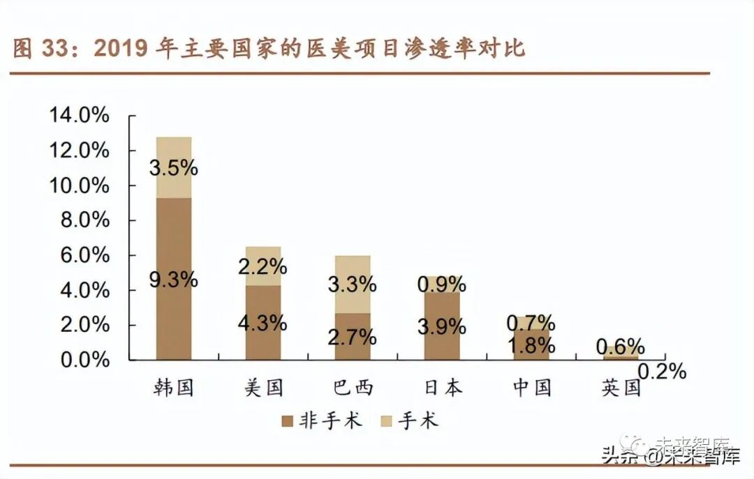 1)需求端:國內醫美市場 2019 年預計 1436 億元(2015-19 年 CAGR 達 29%;手術類/非手術類為 836 億元/600 億元)。①分拆用戶畫像看,女性占 9 成, 年輕化&熟齡化明顯。我們認為,醫美年輕化主要系 90、95 后對新事物接受度高 &花錢意愿強,來自職場及婚戀等多方面壓力更大,在醫美針劑等功效日益齊全+ 小紅書等 KOL 種草+醫美平臺加速推廣普及下,對抗衰老和皮膚保養等醫美需求 實現快速普及。醫美熟齡化則主要是 70 后等新一代熟齡群體擁有更高教育&經濟 條件,對抗衰老醫美的觸達率、接受度和購買力相比 60 后群體均更強,因此對醫 美的使用和滲透率也在快速增長。②分拆需求類目看,輕醫美(非手術類)創傷 小、恢復快及價位適中,對入門群體友好,在我國 2015-19 年收入規模實現翻倍 增長,占比提至 42%。此外,求美群體消費習慣一旦形成難以完全戒掉,高粘性 高復購屬性突出。對比海外,國內目前醫美滲透率低于海外,重點看好國內輕醫 美及醫美整體產業未來 10 年的大發展。