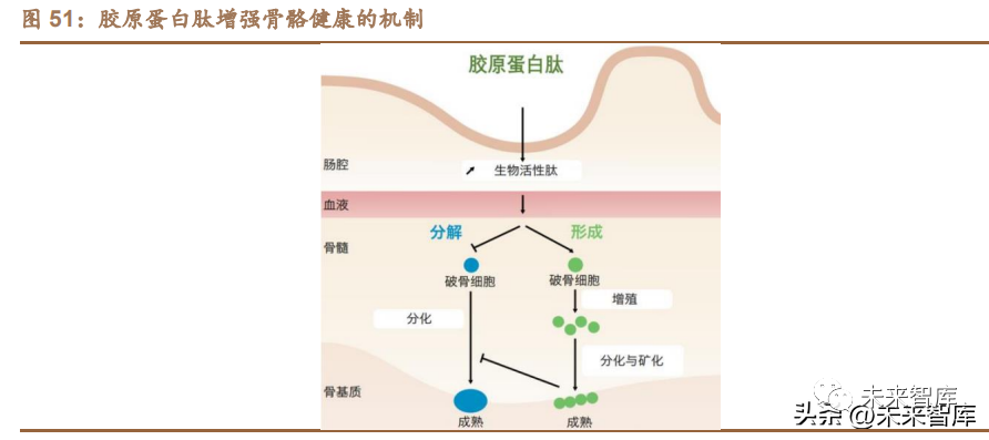 膠原蛋白產品對骨關節疾病有改善效果。研究表明,牛骨膠原肽影響決定成 骨細胞早期分化的主要調節基因(Runx2)的表達,促進人成骨細胞增殖,同時 促進人成骨細胞 ALP(細胞外基質成熟的早期標志)表達,并在成骨細胞分化和 礦化骨基質的形成中發揮積極作用。此外,口服膠原蛋白肽化合物吸收循環后能 在軟骨積累,每天攝入藥物級的水解膠原能減少膝關節或髖關節等骨關節炎患者 的疼痛,這些機制使得膠原蛋白及相應產品對骨關節炎、骨質疏松等疾病具有治 療效果。