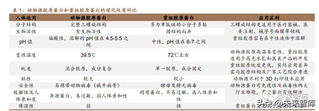 空間結構決定應用,動物源 VS 重組膠原蛋白:理化性質差別明顯,應用端 難以直接區分優劣。(1)結構上,動物源膠原有完整三螺旋結構,基因工程制備 的多為單肽鏈的小分子多肽。結構的差異也導致了生物活性的差異,天然膠原因 其三螺旋結構而具有生物活性,基因工程制備過程中條件不同會產生不同結構和 活性的重組膠原蛋白。(2)pH 值不同:動物源膠原偏酸性,溶解的 pH 值在 4.5-5.5 之間;基因工程膠原溶劑的 pH 值處于 6-7,重組膠原容易在中性液體中溶解。(3)變性溫度不同:天然膠原變性溫度是 39.5℃,在高于這個溫度的情況下性能 呈指數級下降,受到溫度和酸堿變化而馬上降解為明膠,失去生物學功效;基因 工程膠原變形溫度為 72℃左右,更適用于高光水乳和醫美應用產品的開發。(4) 純度不同:動物源膠原成分復雜,提純較難;重組膠原蛋白成分固定,純度可達 95%。(5)粘性不同:動物膠原在相同的 2-3mg/ml 的濃度下,粘性比基因工程制 備的膠原大,不利于 3D 打印技術應用。(6)應用性質不同:重組膠原蛋白比動物 源膠原蛋白安全性更高、致敏性更低、保濕性更強、且與人體具有較高的親和性。整體來看,應用端的差異并無直接結論,往往需要結合多個維度進行判斷,例如 分子結構、生物活性、安全性、保濕度等方面進行綜合比較。