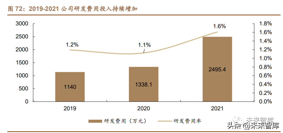 內部高效研發團隊+外部合作,推動“產學研醫”四位一體的全新模式。公司致 力于研發投資,行業領軍人物范代娣任公司首席科學官,范博士入選重組膠原蛋 白生物材料分類與命名專家組,作為國內醫藥行業標準《重組膠原蛋白》起草專 家,在膠原蛋白行業的發展中擔任了重要的角色。2019-2021 年研發成本從 1140 萬提升至 2495 萬,研發費用率由 1.2%提升至 1.6%,在生物活性成分的研究開 發等方面已擁有 20 余年的經驗,實現多項突破性技術創新。公司共有研發人員 84 名,占比 12.6%,其中碩士及以上學歷占比 51.2%,核心研發人員經驗豐富,在 發酵技術、生物醫用材料、天然活性產物方面擁有十多年的研發經驗,絕大部分 研發人員亦具有生物工程、制藥工程及預防醫學方面的工作經驗。對外主要與醫 療機構及學術機構合作開展研發活動,達成“皮膚問題機理機制探究—核心成分和 技術研發與創制—臨床驗證安全性與有效性—產品的推廣應用”的全產業鏈閉環, 從而實現學術研究體系化、科研成果產業化、醫學應用落地化。
