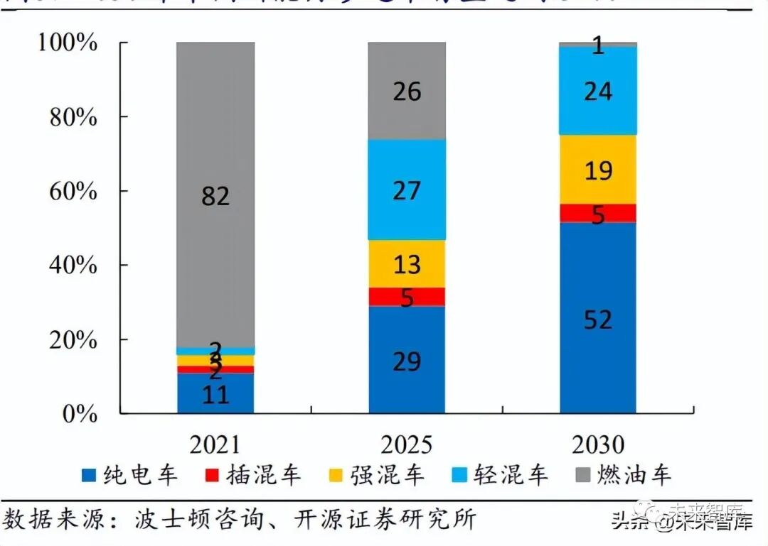 根據乘聯會數據,2022 年 6 月我國新能源乘用車零售銷量 53.1 萬輛,同比增長 130.6%,當月滲透率 27.3%;2022H1 累計零售銷量 224.7 萬輛,同比增長 122.4%, 滲透率 24.3%。相較于 2021 年全年滲透率 14.8%,增長近 10%,已經提前實現 《2020-2035 新能源汽車產業發展規劃》中 2025 年新能源汽車滲透率達到 20%的愿 景。我國新能源乘用車需求已完成了由政策引導向市場驅動的轉變,隨著原油價格 高企、動力電池材料成本下降和汽車“缺芯”問題緩解,新能源汽車滲透率有望進 一步加速。根據波士頓咨詢預測,在 2030 年之前全球純電動汽車的銷量將超過所 有混合動力類型的汽車之和,全球電動車滲透率將達到 44%,而中國電動車滲透率 在 2030 年將達到 57%。新能源汽車行業方興未艾,推動了 SiC 產業鏈的快速發展。