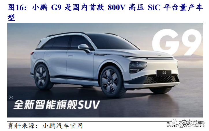 800V 高壓方案也是各大主機廠的主流選擇。目前業界已有至少 10 家車企(大眾 PPE 平臺、奔馳 EVA、現代 E-GMP、通用奧特能、小鵬、比亞迪 e 3.0 平臺、東風 嵐圖、吉利 SEA 浩瀚平臺、廣汽埃安、理想等)宣傳布局 800V 高壓平臺,從量產 時間來看,各大車企基于 800V 系統的新車將于 2022-2023 年陸續上市。其中小鵬 G9 是國內首款采用 800V 高壓 SiC 平臺的量產車型,將于 2022 年 9 月正式上市。小鵬還將鋪設中國首個量產 480kW 高壓超充樁,未來實現超充 5 分鐘,補能超過 200KM 的能力,從而讓 800V 高壓 SiC 平臺的補能效率充分釋放。