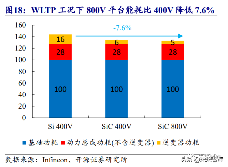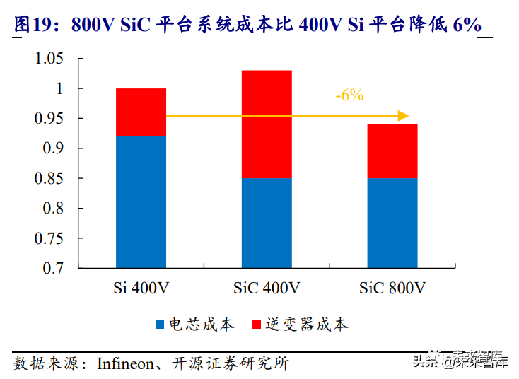 碳化硅對 車輛能耗的降低仍被低估,因為沒有考慮電池系統重量減輕的影響。在系統成本方 面,盡管 SiC MOSFET逆變器是等效Si IGBT價格的2-3倍,然而,由于使用 SiC 后整車功耗降低,車輛系統效率提高,因此需要更少的電池容量。電池節省的成本 超過了碳化硅逆變器增加的成本,采用 800V 高壓 SiC 平臺的系統成本比400V Si IGBT平臺節省高達 6%。
