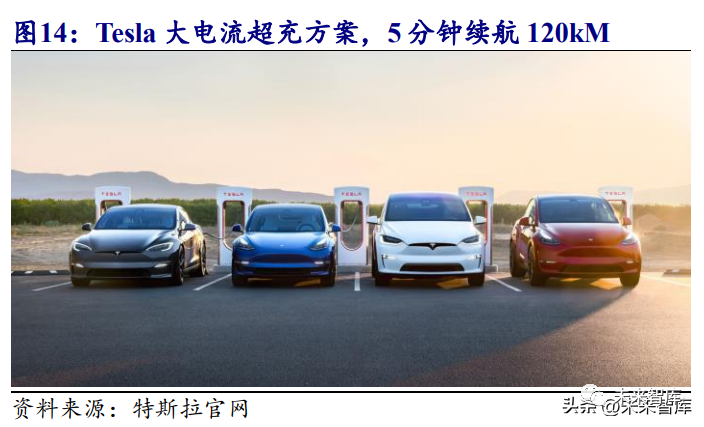 主機廠通過應用更高功率密度的 1200V SiC MOSFET 模塊,可以充分發揮 800V 高 壓平臺和 350KW 直流超充樁的優勢,大幅提高動力系統效率并加速大功率超充的普 及,解決新能源車主“里程焦慮”和“充電焦慮”的問題。根據電功公式 W=U*I*t, 在新能源汽車電池包容量 W 不變的前提下,如果想縮短充電時間 t,可以選擇提高 電壓 U 或者提高電流 I。當前主流的快充方案,主要有兩類:一類是 Tesla 代表的提 升電流方案,在使用 250KW 的 Tesla 超充樁時,在 400V 平臺下最大電流可達到 600A 以上,實現充電 5 分鐘行駛 120km。但根據焦耳定律,提高電流的同時也會 加大整車散熱需求,提高熱管理成本和難度。