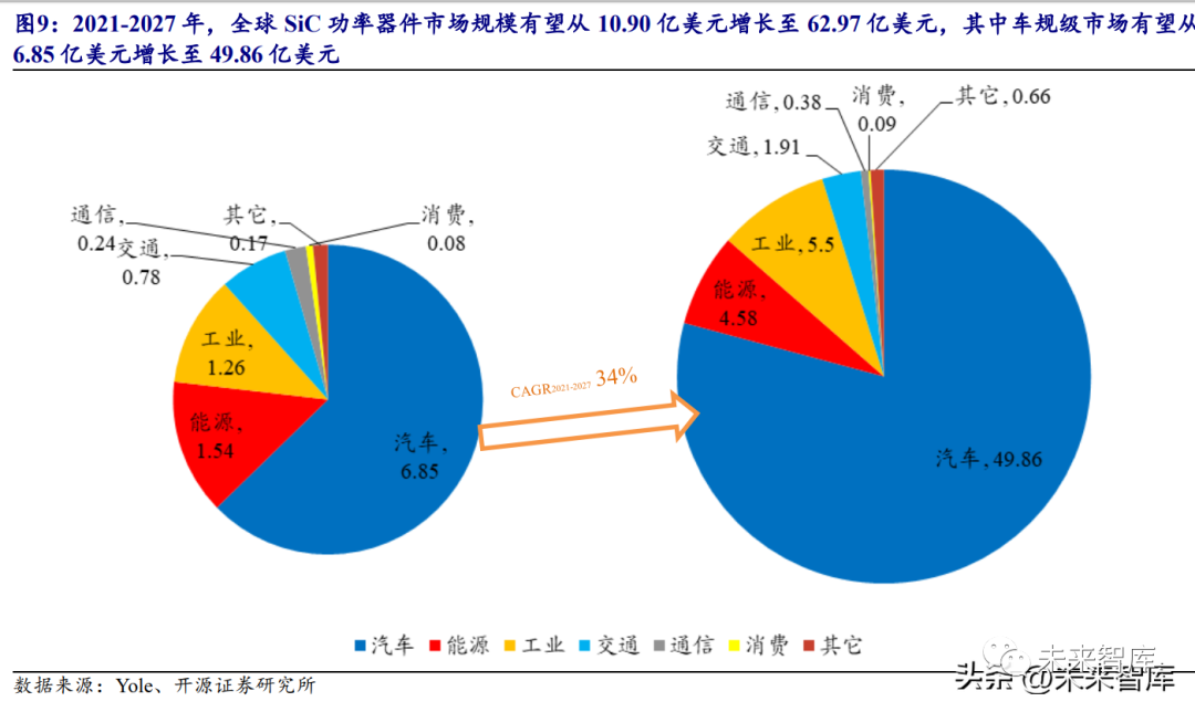 受益于新能源汽車、光伏、軌道交通等下游景氣應用驅動,全球碳化硅功率器件市 場規模不斷擴大,根據 Yole 預測,2021-2027 年全球碳化硅功率器件市場規模有望 從 10.90 億美元增長到 62.97 億美元,保持年均 34%的復合增速。其中,車規級市 場是碳化硅最主要的應用場景,市場空間有望從 2021 年 6.85 億美元增長至 2027 年 49.86 億美元,CAGR 為 39.2%,超過了整個 SiC 功率器件市場增速;車規級 SiC 器件占整個 SiC 器件市場的比例有望從 2021 年 62.84%提升至 2027 年 79.18%。車 規級應用占據近 80% SiC 市場規模,是因為相對于工業級市場和消費級市場,車規 級市場對于 SiC 器件成本更不敏感,通過使用 SiC 器件節省的系統成本(減少電池 成本、被動元器件等)會超過使用 SiC 器件增加的成本。