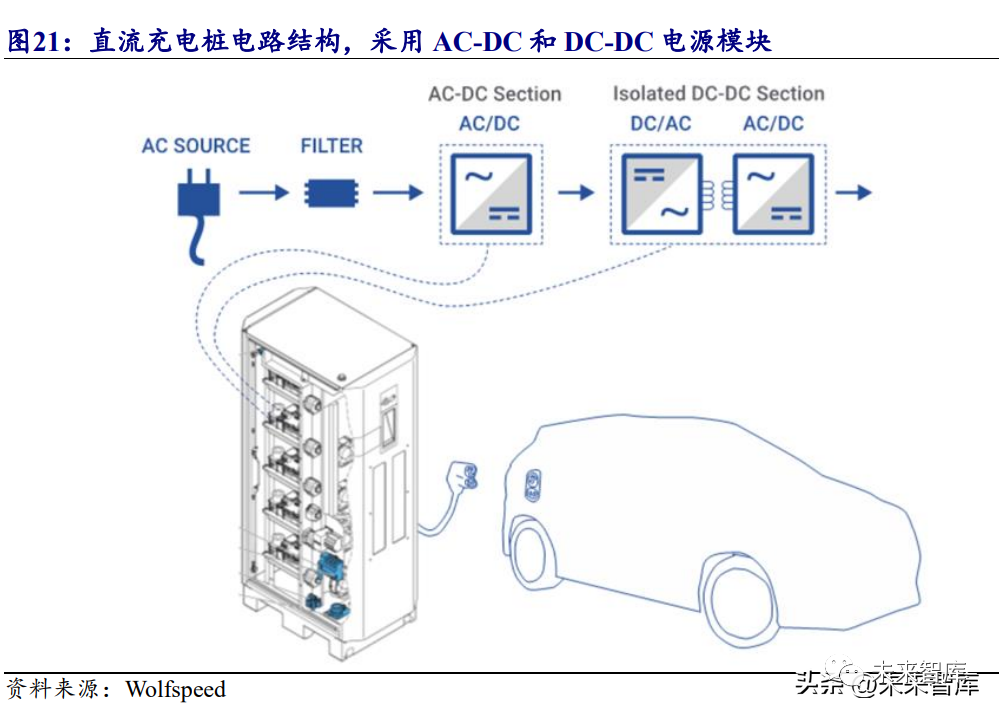 直流快速充電機繞過安裝在電動汽車上的車載充電機(OBC),直接為電池組提供 快速直流充電。直流快速充電機由一級 AC-DC 和一級 DC-DC 組成。充電樁功率覆蓋 50KW-350KW,內部充電模塊從 15KW-60KW 不等。整車電壓平 臺由 400V 向 800V 升級,以及充電樁模塊可擴展化,共同推動了超級充電樁的發 展。車載充電機和充電樁都包含了兩個主要模塊:用于 AC/DC 轉換的主動式前端 (AFE),以及 DC/DC 轉換器。AFE 從電網獲取單相或三相電力,然后輸出到直流母 線,再通過 DC/DC 模塊將其轉換為電動汽車電池快速充電所需的電壓。