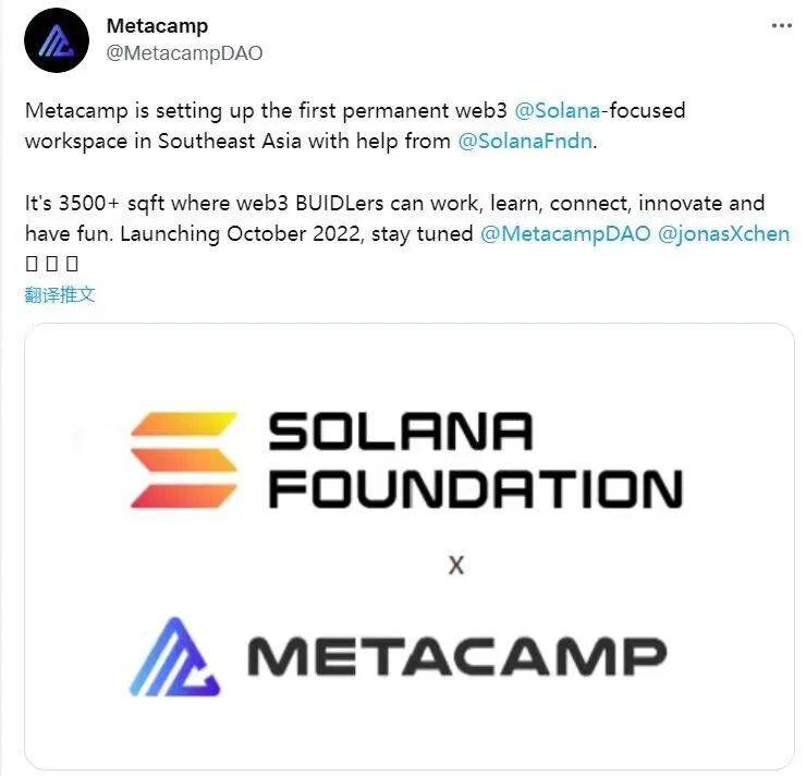 人才社區 Metacamp將推出Web3 工作空間9月25日,Web3 人才社區 Metacamp 發推表示,在 Solana 基金會的幫助下,Metacamp 正在東南亞建立第一個以 Solana 為中心的永久性 Web3 工作空間,該工作空間預計將于 2022 年 10 月推出,面積達 3500 多平方英尺,Web3 建設者可以在這里工作、學習。情報員評論:安得廣廈千萬間,大庇Web3寒士俱歡顏情報來源:https://twitter.com/MetacampDAO/status/1573922041157550080