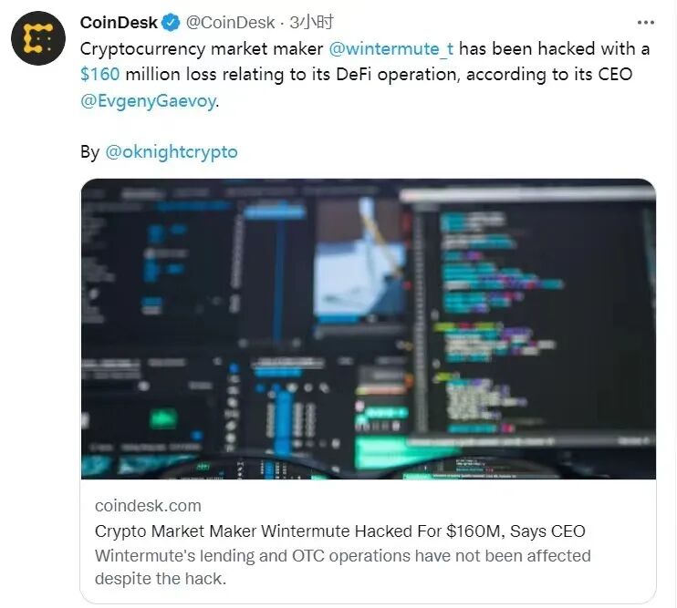做市商 Wintermute再次被盜,損失1.6億美元繼之前轉丟 2000 萬枚 OP 之后,做市商 Wintermute又被盜了。其CEO@EvgenyGaevoy發布消息, 宣稱Wintermute 在 DeFi 黑客攻擊中損失1.6億 美元資金。黑客把盜來的u存在CRV了,目前是CRV第三大持倉人。根據慢霧分析,被盜原因可能是Wintermute被盜EOA錢包是使用Profanity來創建的靚號錢包(開頭0x0000000),此前去中心化交易所聚合器 1inch 發布了一份安全披露報告,聲稱通過名為 Profanity 的工具創建的某些以太坊地址存在嚴重漏洞。情報員評論:Wintermute 二進宮...上次是代幣打錯鏈,太不放人放心了。情報來源:https://twitter.com/CoinDesk/status/1572138195864911876