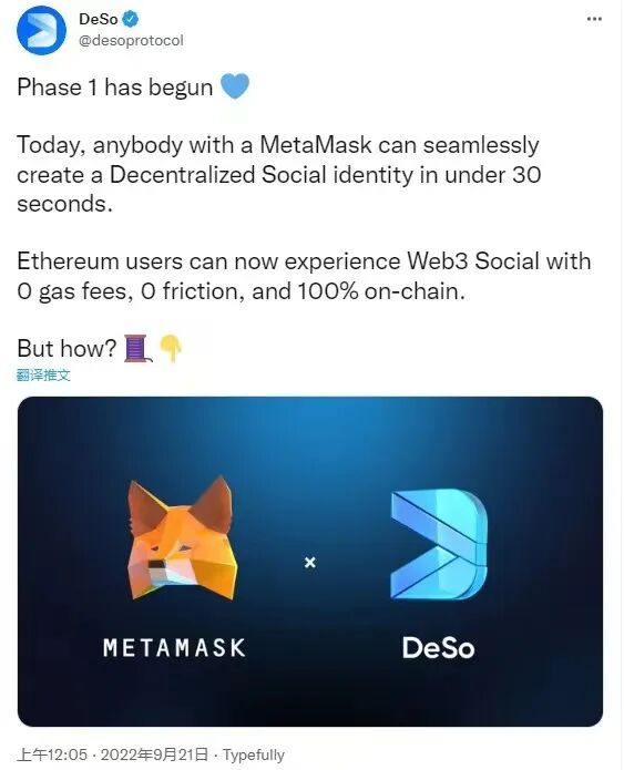 Web3 社交網絡 DeSo 宣布與 MetaMask 集成9月21日,Web3 社交網絡 DeSo 宣布,允許 MetaMask 用戶無縫創建去中心化社交身份。DeSo(BitClout 的底層公鏈)表示,由于 DeSo 的派生密鑰,允許對一個人的帳戶進行可控的訪問共享。在 MetaMask 注冊的情況下,DeSo 使用在 DeSo Identity 中創建和存儲的無限派生密鑰。這個無限派生密鑰將允許 Identity 代表 MetaMask 的主公鑰執行 DeSo 交易,并具有 DeSo Identity API 的所有便利特點,尤其是后臺簽名。另外,在提交授權派生密鑰交易步驟之前,DeSo 向任何符合條件的賬戶空投 0.001 枚 DeSo。情報員評論:MetaMask會是Web3社交賽道上不可回避的重量級選手情報來源:https://twitter.com/desoprotocol/status/1572255622833541121
