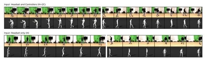 研究人員還進一步發現,即使不用手柄控制器,只需要頭顯的60個姿勢(包含位置和方向數據),就足以重建各種運動姿態,還原出來的效果同樣沒有物理偽影(本不存在卻出現在影像中的成像)。