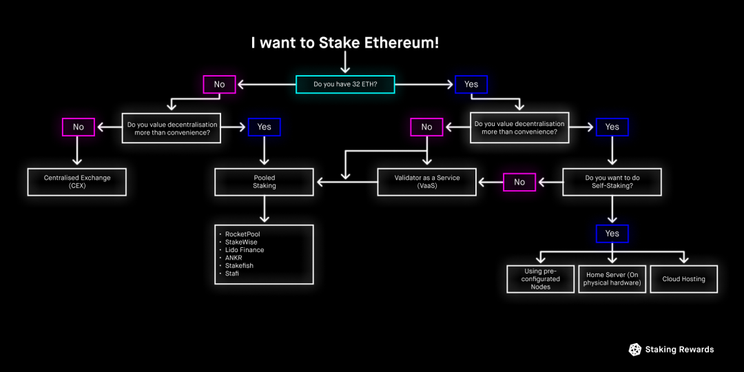 托管質押意味著用戶通過一個中心化實體(即 Binance、Kraken、Coinbase)質押加密貨幣,但這意味著交易所是用戶資產的保管人,用戶將私鑰的管理委托給了交易所,并受其條款的約束。但不太推薦這個選項作為用戶的首選,因為它需要很大的信任假設并且不利于網絡的去中心化。如果用戶不喜歡使用自托管錢包而更喜歡使用中心化交易所的話,那另當別論。但是,還是始終鼓勵用戶支持去中心化并學習如何使用其他選項。如果你是以太坊 Staking 生態系統的新手,看了上面這些還是感到困惑或不知所措,那么下面的樹形圖則可幫助更清晰地了解它們。![]()