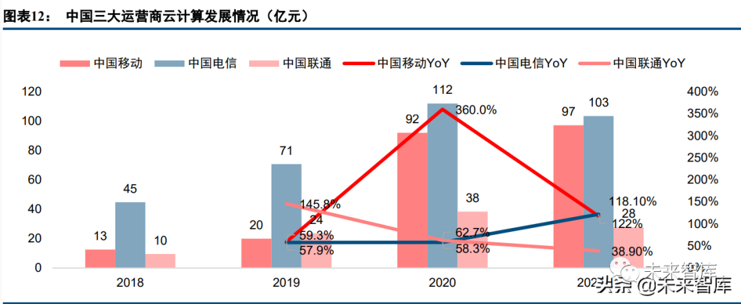 三大電信運營商 2020 年與 2021 上半年云計算業務均實現高速增長,未來將繼續加大投入力度。2020 年, 中國電信、中國移動、中國聯通云業務分別實現收入 112 億元、92 億元、38 億元,分別增長 58.0%、360.0%、 62.7%。當前,電信運營商持續加大云計算投入。例如,中國電信擬在云網融合新型信息基礎設施項目投資 507 億元,按照“2+4+31+X+O”的層次化架構,建設約 30.8 萬臺服務器,在京津冀、長三角、粵港澳、川渝陜等重點區域建設約 8.6 萬架機架,全面實施“云改數轉”戰略。2021H1,中國電信、中國移動、中國聯通云業務 收入分別為 103 億元、97 億元、28 億元(主要是 IaaS 收入),分別增長 122%、118.1%、38.9%。(報告來源:未來智庫)