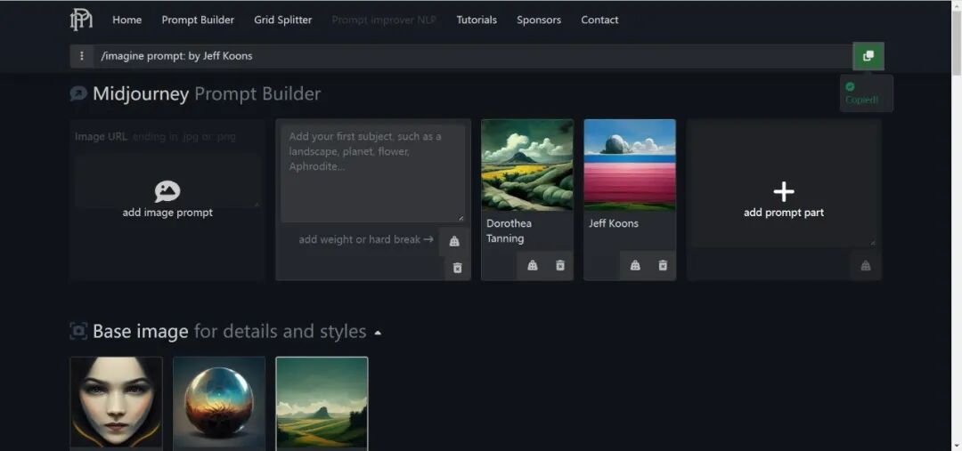 如果你想選擇不同的繪畫風格,可以去prompt-builder,網站上有大量的風格和選項,選擇后直接復制指令就可以回到Discord生成圖片。