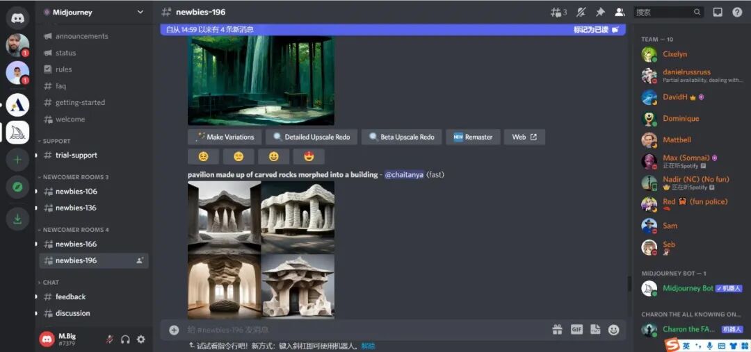 圖片生成過程中,你還能看到房間中全世界使用Midjourney的網友生成的圖片。