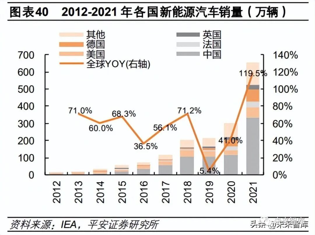 全球政策推動下,新能源汽車銷量實現高速增長,2021年全球銷量超650萬輛,2017年-2021年年均復合增長率達 53.7%, 其中歐洲國家是海外銷量增長的主要驅動力,德國、意大利等年均復合增長率均超 100%。我國 2021 年新能源汽車銷量超 330 萬輛,全球占比超 50%,滲透率快速提升至 13.4%。