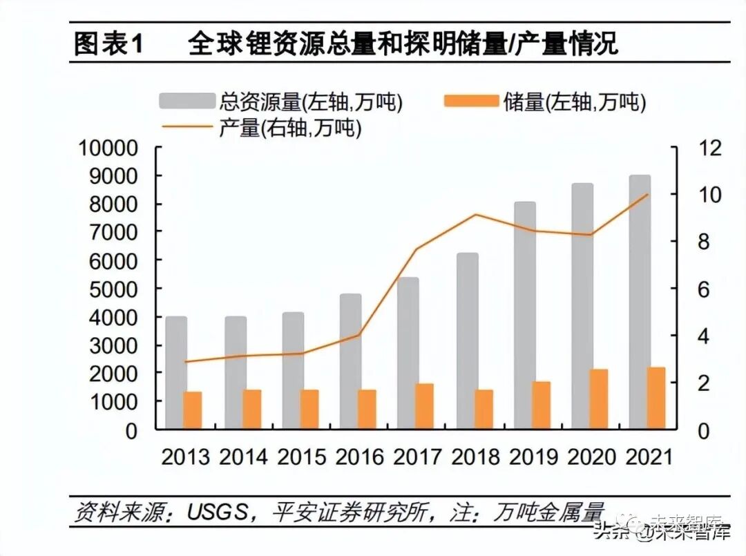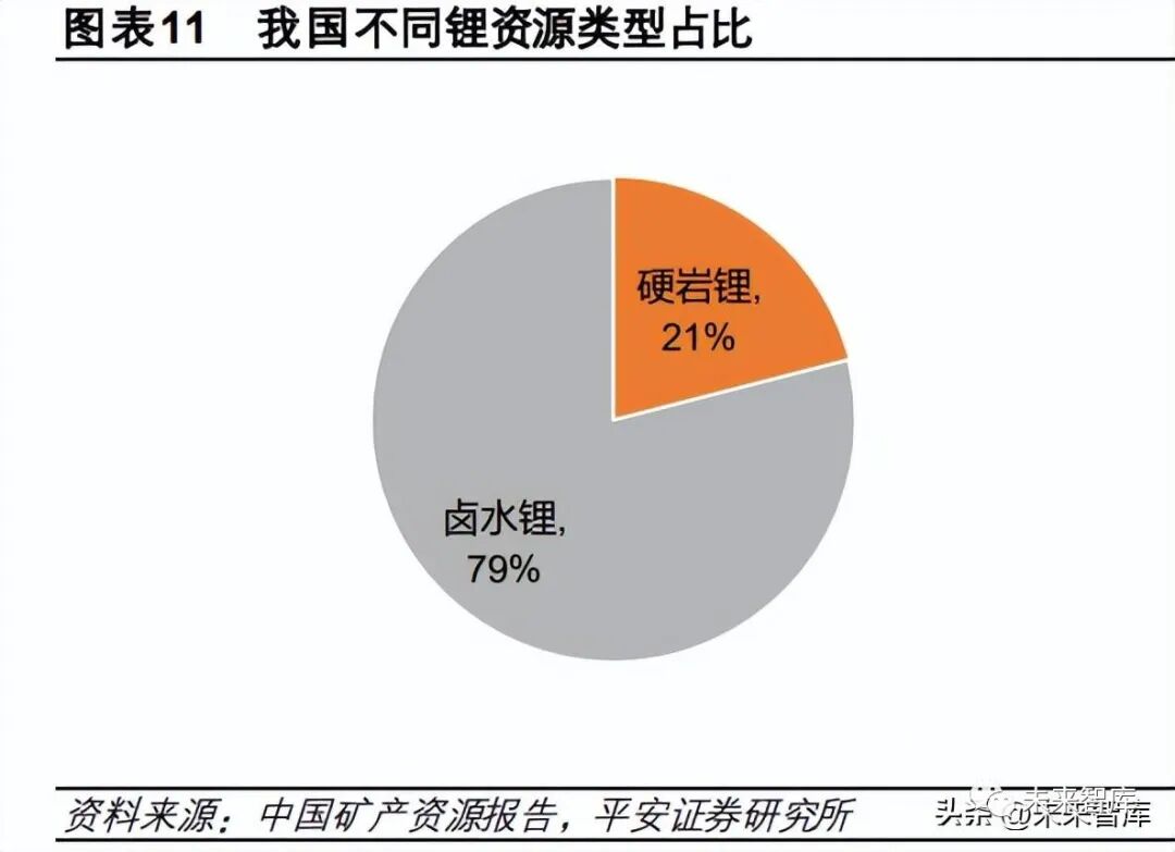 鋰是自然界中第 33 豐富的元素,在地殼中含量相對較高,主要以鹽湖鹵水(58%)、硬巖性鋰礦(26%)及鋰黏土礦(7%) 等形式分布于南美、澳洲及北美等地。但高品位優質鋰礦和低鎂鋰比鹽湖鹵水資源稀缺,且全球鋰資源分布不均,導致鋰 資源總量和實際可探資源量、即期產能間存在極大差異。2021 年全球鋰資源總量約為 8900 萬噸(探明儲量約為 2200 萬噸),總量較上年增加 300 萬噸,主要集中在南美三角區和 澳大利亞,兩地鋰資源占全球總資源量的 65%。其中,南美三角(玻利維亞、阿根廷、智利)占比高達 56%,是鹵水鋰資 源最為集中的地區;澳大利亞占比為 8%,硬巖型鋰礦(鋰輝石、鋰云母、透鋰長石等)為主,貢獻當前全球 50%以上的 鋰產品產量;國內鋰資源80%以上存在于鹵水中(鹽湖鹵水為主,其余為地熱鹵水、油田鹵水、井鹵水),品質相對南美三 角要低,鎂鋰比高導致所需的開采技術要求更為嚴苛。