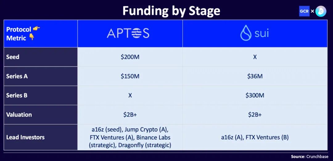 Aptos 和 Sui 在經歷幾輪令人瞠目結舌的融資后,其知名度迅速上升。Aptos Labs 在 2022 年 3 月獲得由 a16z 領投的 2 億美元戰略投資,隨后是 7 月由 FTX Ventures 領投的 1.5 億美元 A 輪投資。此外,Sui 開發團隊 Mysten Labs 在 2021 年 12 月獲得了 3600 萬美元 A 輪融資,以及完成了最近 9 月由 FTX Ventures 領投的 3 億美元 B 輪融資。Binance Labs和Dragonfly也加入了這一行列,在 Mysten 宣布最新一輪融資后,它們都在 9 月底對 Aptos 進行了戰略投資。