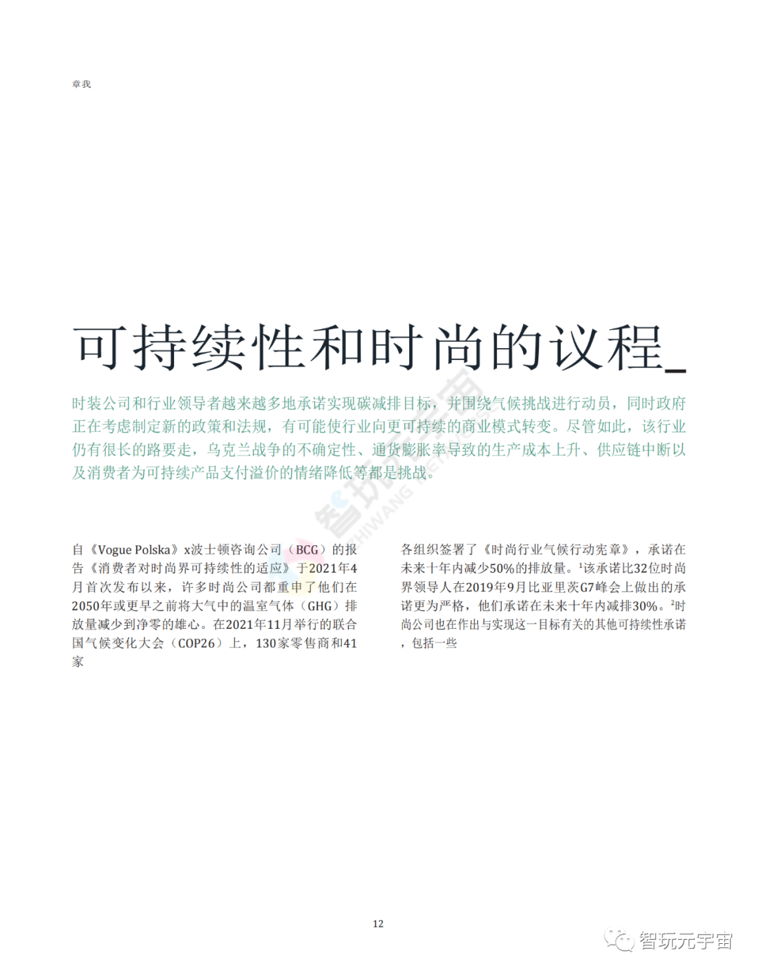 氣候問題長期困擾著時尚界,盡管集體動員起來減少排放,但仍有許多工作要做。引入新法規和政策的努力,如對服裝的壽命和可回收性的要求,有可能進一步改變行業對可持續發展的承諾。時尚品牌必須遵守這些即將出臺的法規,鑒于當今不穩定的政治經濟環境,這項任務并非沒有挑戰。同時,一個新的突出的數字趨勢--元氣圈的時尚--正在興起,關于它對可持續性的影響,人們幾乎沒有共識。被認為是下一代互聯網的metaverse,是一個與物理世界緊密相連的虛擬現實。雖然這一愿景仍處于初始階段,導致了各種不同的解釋和定義,但不可否認的是,它是令人振奮和多變的。對于時尚界來說,元空間的潛力在于它與三組技術的交叉。盡管數字時尚起源于游戲中被稱為皮膚的化身裝束,但在元空間中,沒有什么能限制設計師的想象力。元空間時尚可以是增強現實服裝、數字藝術,甚至是連接物理和虛擬現實的數字物品。一些有遠見的品牌已經在元空間平臺上創建了數字空間,而其他品牌則在元空間平臺上推出了NFT降價活動。知名的虛擬設計師。作為一個整體,時尚界正在迅速擁抱元空間。我們的分析顯示,在這一趨勢開始后的兩年里,全球120家領先的時尚公司中,有三分之一已經嘗試了元空間。這些品牌在這個過程中不斷發現、學習和盈利。我們估計,自從耐克收購數字原生品牌RTFKT以來,前三個Nike x RTFKT NFT的價值相當于2.5億美元,在2022年推出的時尚NFT系列3.6億美元的市場價值中占三分之二。隨著數以千計的NFTs的創建和數百萬美元的市場交易,有一點很清楚:這只是一個開始。盡管元空間的早期問題--例如對圖形質量的擔憂、數據流的限制以及無法在元空間的各種共存空間中移動資產--但對品牌來說,機會是有吸引力的,因為它們開啟了與客戶接觸和社區建設的新方式。我們承認,對于普通觀眾來說,元空間可能聽起來是一個抽象的概念,許多人對它持懷疑態度,擔心它會減少我們都重視的面對面的互動。然而,我們認為,元空間不是一場革命,而是我們今天所知道的互聯網的逐步演變。在我們看來,雖然是一個漸進的過程,但我們可能早晚都會生活在元空間中。我們的研究表明,消費者越來越關心他們的數字形象,特別是在亞洲,45%的數字用戶回答說他們的數字形象與他們的身體形象同樣重要。本報告包含中英文版本,以下為中文版,需要英文版的請看最后一頁!![]()
