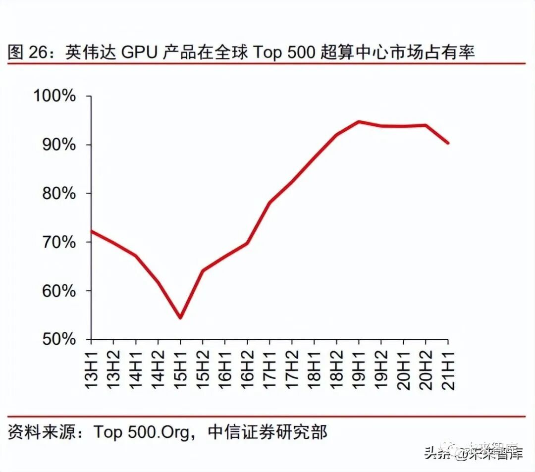 市場格局:英偉達 GPU 在 AI 訓練、高性能計算領域占據主導地位。作為圖形渲染之 后另一主要應用場景,目前客戶主要通過在數據中心部署英偉達、AMD 的 GPU 芯片,實 現 AI 訓練、高性能計算等,同時輔以自研加速卡等,服務于特定場景的 AI 訓練、推理等。1)根據 Liftr Insights 數據顯示,2021Q1,在全球 TOP 云廠商數據中心 AI 加速芯片市場, 英偉達份額占比為 78%,近年來基本穩定在 80%附近,市場領先地位穩固。同時根據 Lifter 2019 年 5 月的數據顯示,全球四大云計算平臺阿里云、AWS、Azure 和谷歌云(GCP) 中,英偉達 TESLA 系列 GPU 產品的市場占有率大幅領先。其中,阿里云采用英偉達 TESLA 系列 GPU 比例為 81%,AWS、Azure 和 GCP 使用比例分別為 89%、100%和 100%,市 場份額絕對領先。2)另外據 Top500.Org 數據顯示,英偉達 GPU 產品在全球 Top 500 超 算中心的滲透率逐年提高,由 2013H1 的 72.2%提升至 2021H2 的 90.3%,幾乎處于壟斷 地位。