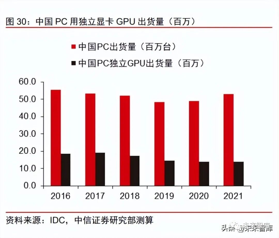 圖形渲染:當前國內市場規模約 27 億美元,預計 2025、2030 年將分別達到 47、97 億美元。由于缺乏直接的統計數據,我們做出如下簡化假設:1)IDC 數據顯示,2016-2021 年,全球 PC 出貨量為 2.6-3.5 億臺,同期國內 PC 銷量占全球銷量比重約在 17%左右, 我們假設在圖形渲染領域,國內 GPU 出貨量占比亦和 PC 表現相對一致,并保持和全球 市場相似的增速,以及應用場景分布等。參考我們在上文中的測算,我們測算、預測 2021 年、2025 年、2030 年,國內 GPU(圖形渲染)的市場規模約為 27、47、97 億美元。當 然,若考慮到國內龐大的游戲用戶數,以及專業視覺等領域的旺盛需求等,最終的實際數 據料將大幅優于我們當前的測算&預測。