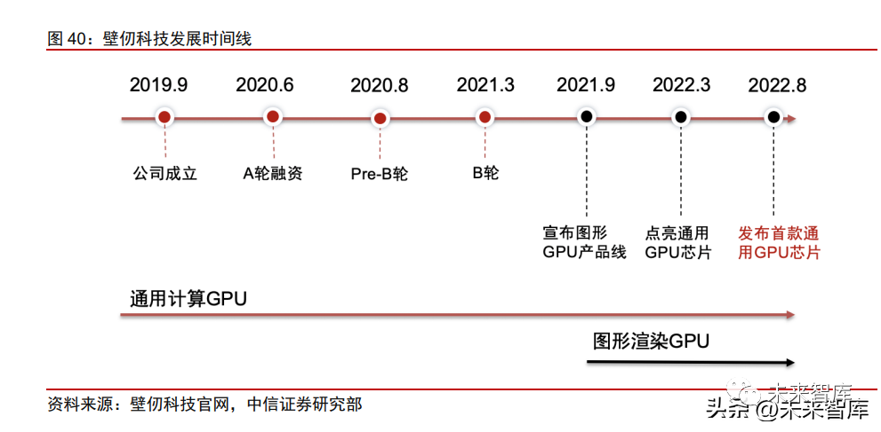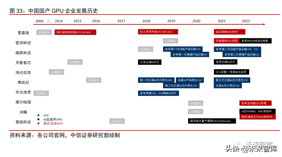 英偉達背景出身,打造研運一體 GPU 公司。成立于 2020 年 10 月,致力于構建視覺 計算及人工智能領域計算平臺,研發全球領先的 GPU,建立高性能計算生態系統。摩爾線 程擁有能夠覆蓋 GPU 研發設計、生產制造、市場銷售、服務支持等完整成熟的團隊,逐 步成為國產現代全功能 GPU 實現的核心力量。創始人張建中是前英偉達全球副總裁,中 國區總經理,英偉達中國公司創始人,曾任惠普、戴爾公司高管。全功能 GPU 蘇堤問世。公司成立不到 300 天的時間,于 2021 年 11 月公布首顆國產 全功能 GPU 芯片研制成功,開創國產 GPU 研發速度先河。2022 年 3 月 30 日,公司推 出基于其統一系統架構 MUSA 的首款 GPU 蘇堤、基于蘇堤的首款臺式機顯卡 MTT S60、 首款數據中心級產品 MTT S2000,開拓 GPU 在中國市場的生態系統,助力驅動數字經濟 的發展。