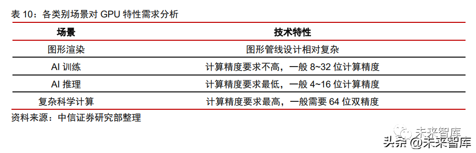 AI 訓練:大模型逐步成為 AI 領域的主流,疊加下游自然語言理解、計算機視覺、 推薦系統等應用場景的不斷擴展,AI 訓練料將成為中期國內 GPU 最大的需求領 域。同時 AI 模型更多基于神經網絡結構,因此對計算精度要求并不嚴苛,亦使 得本土 GPU 廠商面臨的技術門檻相應降低,我們預計這將是本土 GPU 廠商最容 易實現突破的領域。