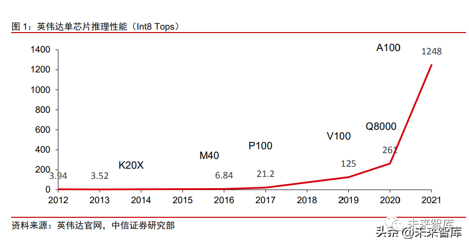 產品豐富度&技術競爭力:英偉達系統級產品布局、在訓練環節的突出表現&領 先優勢已基本成為市場的共識,而在推理領域,伴隨新一代安培架構、Hopper 架構的升級,以及由此實現的訓練、推理的統一,以及對稀疏矩陣運算問題的良 好支持,目前在推理方面,英偉達最新的 A100 芯片的 Int 8 Tops 已經達到 1248, 較上一代提升超過 5X。同時在訓練環節,根據 Mlperf 的評測,在圖像識別、對 話式 AI、推薦系統等多個模型的對比評測中,英偉達芯片訓練性能全面領先華為、 谷歌等主要競爭對手。基于技術層面的全面分析,我們判斷英偉達有望在企業對 外服務(訓練、推理)、企業內部服務(訓練)環節保持持續領先,但在企業內 部服務(推理)仍面臨延遲、功耗等層面的明顯短板。而我們看到,英偉達在數 據中心市場的產品迭代節奏繼續延續既有的習慣,即繼續保持對芯片性能的狂熱 追逐,以及每兩年升級一次產品(CPU、DPU、GPU)的頻率。