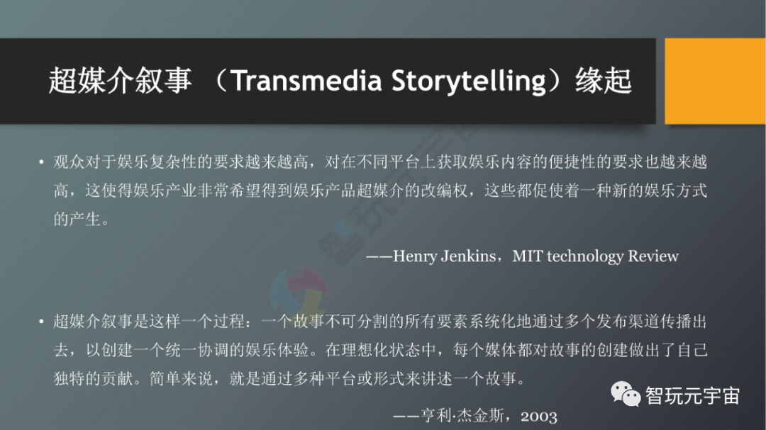 超媒介敘事 (Transmedia Storytelling)緣起 觀眾對于娛樂復雜性的要求越來越高,對在不同平臺上獲取娛樂內容的便捷性的要求也越來越高,這使得娛樂產業非常希望得到娛樂產品超媒介的改編權,這些都促使著一種新的娛樂方式的產生。——Henry Jenkins,MIT technology Review 超媒介敘事是這樣一個過程:一個故事不可分割的所有要素系統化地通過多個發布渠道傳播出去,以創建一個統一協調的娛樂體驗。在理想化狀態中,每個媒體都對故事的創建做出了自己獨特的貢獻。簡單來說,就是通過多種平臺或形式來講述一個故事。——Carlos Alberto, International Journalof Communication,3,2009![]()