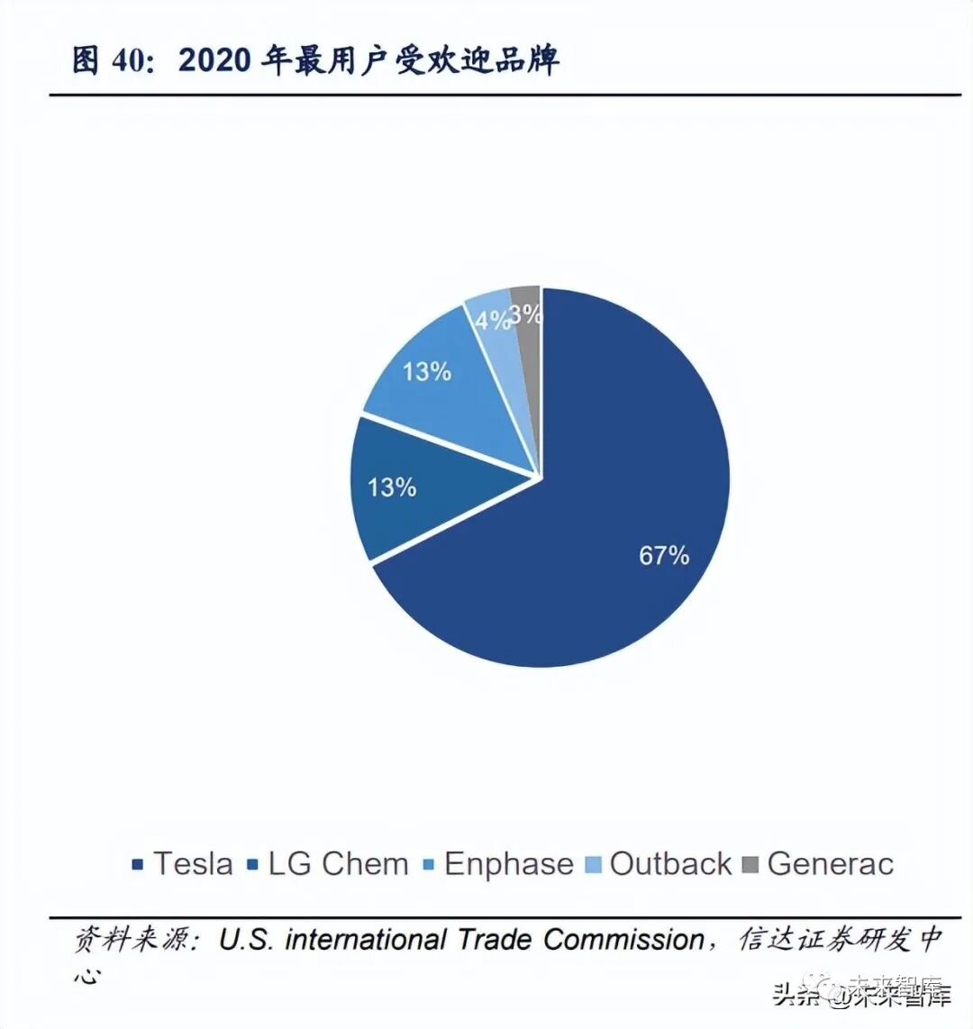 特斯拉:強大的品牌力、優質的產品力、優秀的技術路線、良好的經濟性,造就最強消費 屬性。1)品牌力方面,特斯拉作為全球新能源車龍頭企業,具有較高的品牌力,而公司的 戶儲產品有望享受到新能源車品牌力的協同效應。另外,根據 2020 年 U.S. international Trade Commission 的調查,特斯拉是美國絕對受歡迎的品牌,占比 67%,而安裝商最常 進貨的品牌中,特斯拉占比 17%,位列第三。2)產品力方面,第三代 Powerwall+較之第 一代產品,存儲容量增加了一倍以上,達到了 13.5kwh,且集成了電池充電器及太陽能逆 變器,已成為完整的多合一太陽能存儲系統。3)技術路線方面,特斯拉戶儲技術路線與電 車相仿,第三代產品對殼體提出更高要求。目前新一代產品采取完整液冷系統進行熱管理, 使其具備了更高溫度運行的可能性,提高了整體的循環次數,與汽車系統相仿,可具備加 熱和冷卻的功能,第三代產品采用 21700 圓柱三元電池,有效提高儲能電池的能量密度, 同時采用高度集成化方案,以起到降低重量、提高效率、降低成本的作用。4)經濟性方面, 特斯拉的戶儲產品有一體化趨勢,一體化趨勢主要針對增量市場,儲能系統硬件成本僅占 總成本不到 50%(海外市場)。一體機一方面可以為投資者簡化安裝并便于售后維修,有 效節約后續成本,另一方面,可避免經銷商與安裝商在各自環節分別對太陽能逆變器進行 40-60%的加價,使得一體機產品的售價更具性價比優勢。