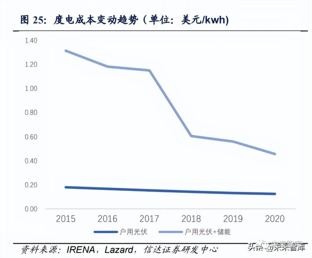 我們以美國為例,測算得到其他條件不變的情況下,總成本下降5%,IRR提高約1.7pct, 并且隨著成本下降幅度增大,邊際效果增強。總成本下降對光儲系統的收益體現在兩方面, 一是初始投資下降,二是維修成本與電池更換成本下降。總成本下降可以說是最直接的增 加 IRR,提高光儲系統經濟性的方式,有些美國地區政策給購買光儲系統的用戶現金補貼, 比如亞利桑那州宣布 2018 年 5 月 1 日起 3 年內,對購買和安裝合格的電池儲能系統并參與 SRP 電池研究計劃的用戶可獲得最高 1800 美元的補貼,政府補貼實際上相當于降低了總 成本,提高經濟性。從 IRR 的影響來看,政府補貼將大幅提高戶儲系統的經濟性,從而提 高居民用戶的購買積極性。另外,我們可以看到成本下降(其他條件不變)對 IRR 的增加效果有邊際效果增強的規律, 成本下降幅度從 0%-5%,IRR提高 1.7pct,成本下降幅度從 20%-25%,IRR提高 3.8pct。IRR 為初期投資與未來現金流現值相等的折現率,而折現率對未來的現金流的折現效果邊 際遞減,因此雖然減少的額度相同,但是初期投資越低,IRR 提高越大。未來成本逐步降低,IRR 的提升將愈加明顯,經濟性推動戶儲發展將愈加迅速。其他條件不變,電價上升 0.1 美元/kWh,IRR 提高約 1pct。電價對 IRR 的影響實際上是提 高了光儲系統的節省電費的收益,電價越高,消費者的用電成本越高,相應的光儲系統的 收益越高。該效果是線性的,電費提升將固定比例提高所有收入,戶儲的收入結構并不會 變化。