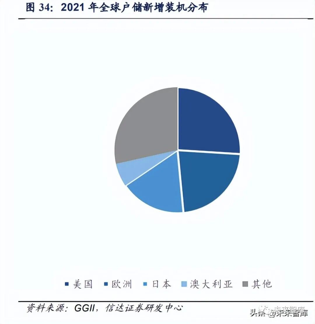 戶儲裝機維持高增,歐美日澳主導市場。全球戶用儲能裝機量近年穩步增長,5 年 CAGR 為 62.62%,2021 年新增裝機量約為 6.4GWh,同比增長 116.23%。據 Statista 統計,歐洲 市場領跑戶儲裝機,20 年新增裝機約占全球 40.38%,其中德國占比達 25.16%;美國與日 本緊隨其后,占比分別達到 23.65%與 17.88%,歐美日澳合計占比約 90%。