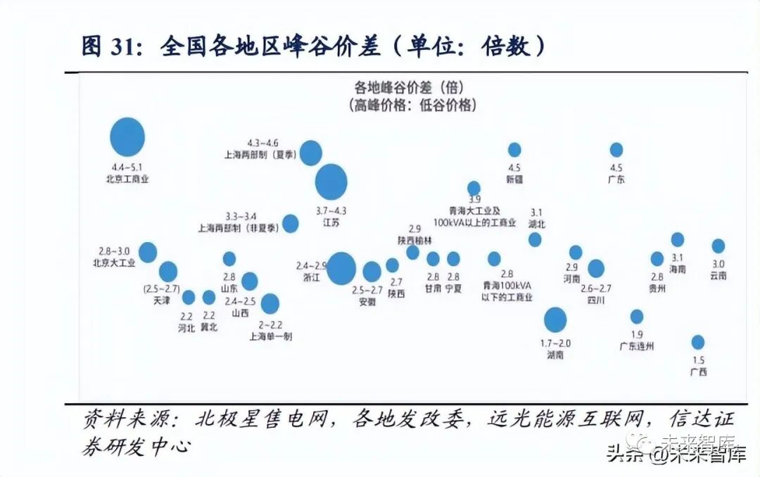 政策推動,峰谷價差進一步拉大。2021 年 7 月 29 日,國家發改委發布《關于進一步完善 分時電價機制的通知》,推動從用戶側需求端提升系統調節能力,要求合理確定峰谷電價價 差,上年或當年預計最大系統峰谷差率超過 40%的地方,峰谷電價價差原則上不低于 4:1;其他地方原則上不低于 3:1。同時,要求各地在峰谷電價的基礎上推行尖峰電價機制,主要 基于系統最高負荷情況合理確定尖峰時段,尖峰電價在峰段電價基礎上上浮比例原則上不 低于 20%。