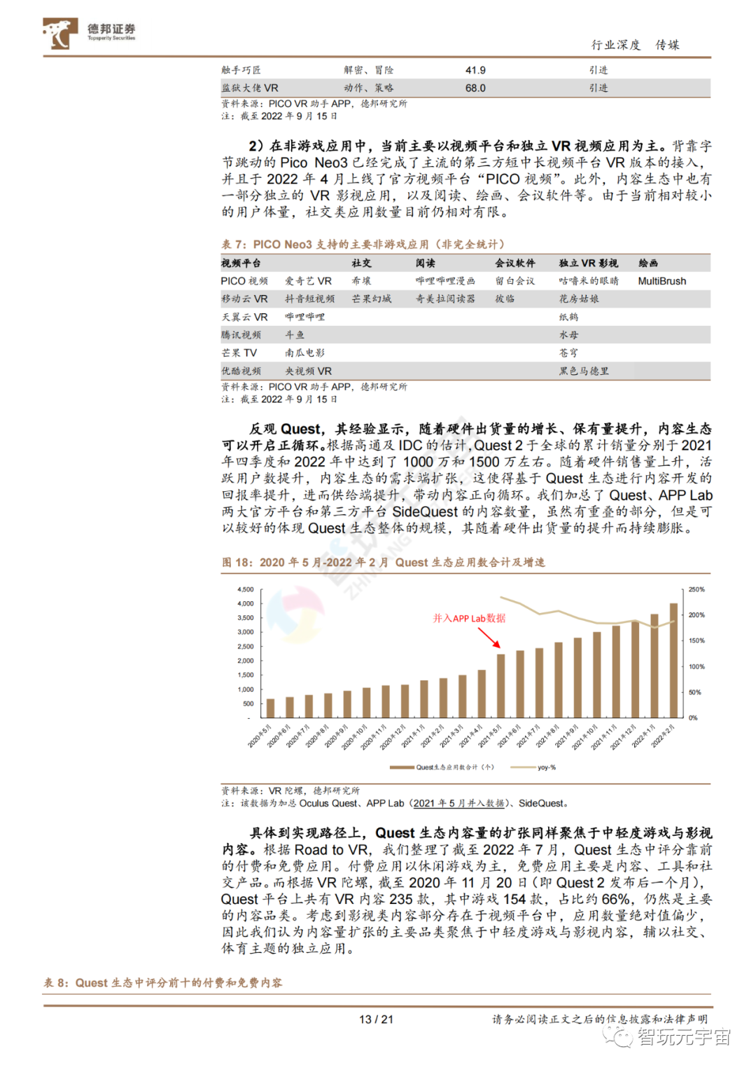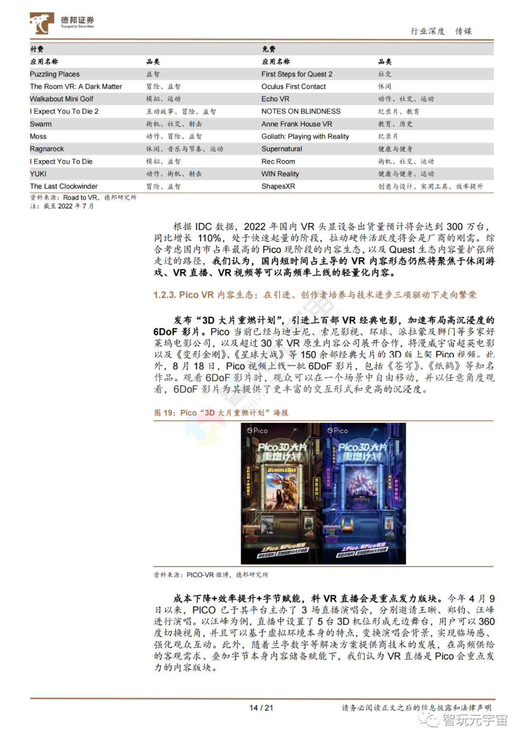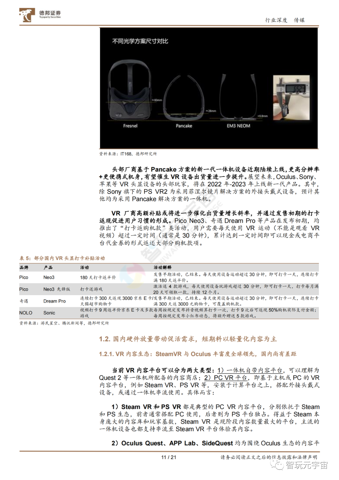 Pancake 帶來體驗優化,廠商補貼疊加內容供給優化,國內 C 端 VR 頭顯有望迎來放量。全球 VR 頭顯出貨量 2020 年開始放量并維持。根據 VR 陀螺,2021 年全球出貨量達到 1110 萬臺,2022 年有望達到 1450 萬臺,后續 2023 年有望較 2021年實現翻倍增長。而反觀國內,根據 IDC,2021 年出貨量約為 143 萬臺,2022年則有望達到 300 萬臺,同比增長 110%。我們認為 VR 設備的行業邏輯與當初的智能手機相類似:技術革新-新品上線-廠商補貼-硬件放量-內容繁榮-繼續放量-內容質量提升-形成正循環。具體到 VR 頭顯設備上,Pancake 光學鏡片解決方案技術成熟,可以將頭顯設備的光機模組厚度,由之前菲涅爾透鏡的 40-50mm 減少至18-25mm。今年以來上線的 YVR2、創維 PANCAKE1、PICO 4、Quest Pro 均采用了 Pancake 解決方案,并且后續即將發布的蘋果 MR 眼鏡也有望采用。Pancake解決方案成為主流后,一體機的便攜性、佩戴舒適度均有望迎來加強,加之整機廠商發售初期的補貼和內容供給的優化,我們認為國內 VR 頭顯有望在 C 端迎來放量。 國內硬件放量帶動促活需求,短期以輕量化內容為主,但日漸豐富。當前國內的VR 內容生態,相比于全球領先的 SteamVR、Oculus 生態尚有一定差距。我們認為,在硬件滲透的早期,存量設備數量有限,內容將會以第一方、第二方供給為主,主機廠商對于內容生態有較強的話語權;后續隨著出貨量、存量設備提升,當活躍用戶數足夠支撐獨立內容供給者盈利,第三方生態將會快速繁榮。以國內硬件占比較高的 Pico 為例,當前其內容生態由游戲、視頻、工具及社交等構成,以海外引進的游戲、影視內容,及國內音視頻平臺為主。綜合考慮 Oculus 的經驗,和國內C 端有望放量的預期,我們認為國內的 VR 內容生態,短期內將以休閑游戲、直播、視頻等輕量化且可以高頻供給的內容為主導,滿足硬件促活的剛性需求。![]()