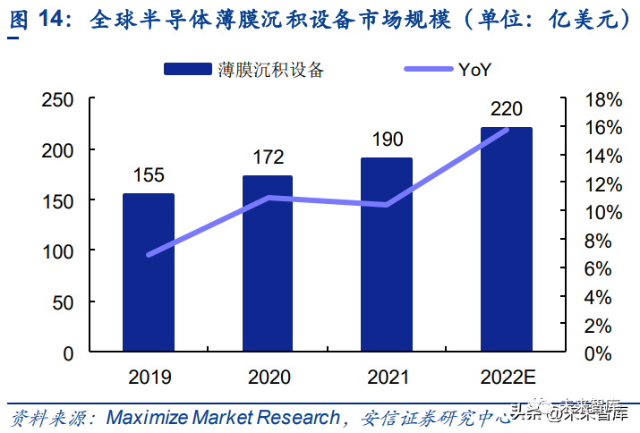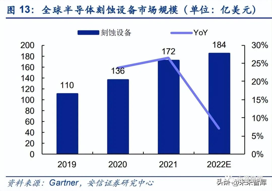 半導體射頻電源主要應用于刻蝕設備、PVD 和CVD設備,粗略估算,2022年全球半導體射頻電源市場規模超過 26億美元。根據 Gartner數據,2022年全球半導體刻蝕設備市場規模將達到 184 億美元,同比增長 6.98%。根據Maximize Market Research數據,2022年全球半導體薄膜沉積設備市場規模預計將達到220億美元,同比增長15.79%。按照半導體設備毛利率 46.5%、一臺半導體設備射頻電源約占成本的12%的假設來測算,2022年全球半導體刻蝕設備用射頻電源市場規模為 184 億美元(1-46.5%)12%=11.81億美元,全球半導體薄膜沉積設備用射頻電源市場規模 14.12 億美元。考慮到其他半導體設備中亦會使用到射頻電源,如離子注入設備,2022年全球半導體射頻電源市場規模將會超過26 億美元。