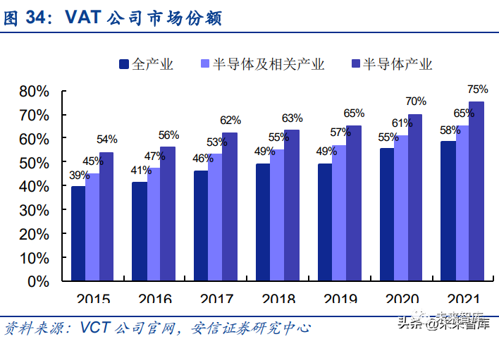 VAT 公司的核心產品是各類閥門,2021 年閥門占公司營業收入的 81%。從分市場營收占比 來看,半導體相關業務是支撐公司業績持續增長的重要驅動力,2021 年,VAT 公司約有 75% 的營業收入來自半導體相關業務。同時,VAT 公司不斷擴大市場份額,2021 年,公司全產 業、半導體及相關產業、半導體產業的真空閥市場份額分別達到 58%、65%、75%,七年 來份額不斷提升,是當之無愧的真空閥行業領軍者。