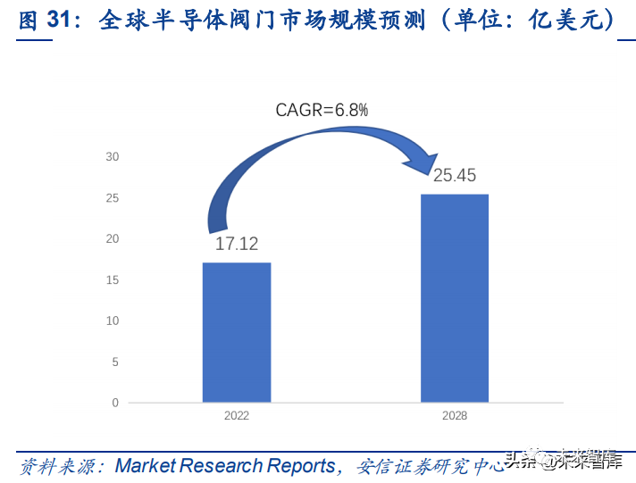 根據 Market Research Reports 的數據顯示,全球半導體閥門市場預計 2022 年規模將達到 17.12 億美元,預計到 2028 年市場規模達到 25.45 億美元,在 2022-2028 年預測期間的 復合年增長率為 6.8%。半導體閥門全球主要制造商包括 VAT Vakuumventile、Parker、Fujikin、CKD、Swagelok、 MKS、SMC Corporation、GEM、Entegris 等。根據 Market Research Reports 數據顯示, 2021 年全球前五名的收入份額約為 68.61%,市場集中度相對較高。
