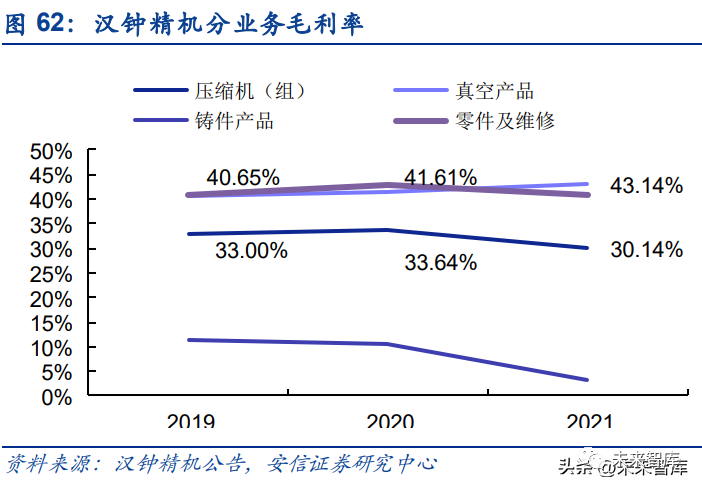 從營收結構看,公司傳統業務壓縮機整體保持穩健增長,真空泵業務營收增速迅猛,占營 收比重從 2019 年的 20.43%增長到 2021 年的 34.98%。2021 年,壓縮機(組)、真空產品、 鑄 件 產 品 和 零 件 及 維 修 營 業 收 入 分 別 為 16.97 億 ( YoY+17.45% )、 10.43 億 (YoY+59.71%)、0.58 億(YoY+50.77%)、1.76 億(YoY+34.89%),占公司整體收入比 例分別為 56.93%、34.98%、1.94%、6.15%。從分業務毛利率看,公司壓縮機業務維持在 高于 30%的水平,真空泵業務毛利率逐年提升,2021 年真空產品毛利率達到 43.14%。