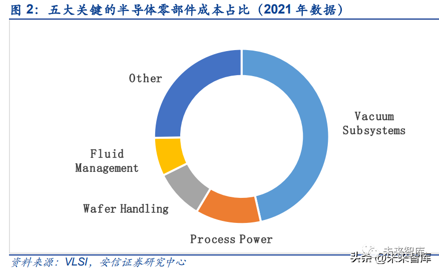 各類半導體設備都可以分解成若干個模塊,由多個子系統組成。根據 VLSI 公司統計分類, 半導體設備由八大關鍵子系統組成:氣液流量控制系統、真空系統、制程診斷系統、光學 系統、電源及氣體反應系統、熱管理系統、晶圓傳送系統及其他關鍵組件。其中,真空系 統、電源系統是較為關鍵的子系統,成本占比均在 10%以上。前者主要包括各類閥、泵, 后者則以射頻電源等為主。