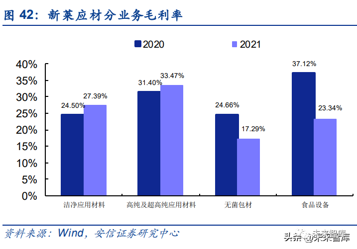 根據公司投資者調研紀要內容顯示,公司半導體產品使用量約占芯片廠總投入 3%-5%左右, 約占在半導體設備廠,原材料采購額的 5%-10%,市場空間超過 500 億人民幣。從營收結 構來看,公司無菌包材、高純及超高純應用材料和潔凈應用材料是公司的主要業務,其中, 泛半導體領域的高純及超高純應用材料業務營收增速迅猛。2021 年,公司高純及超高純應 用材料、潔凈應用材料、無菌包材營業收入分別為 5.32 億元(YoY+82.80%)、5.92 億元 (YoY+52.34%)、8.16 億元(YoY+41.03%),占公司整體收入比例分別為 25.90%、 28.80%、39.74%。公司的高純及超高純應用材料毛利率也在逐步提升,從 2020 年的 31.40%提升到 2021 年的 33.47%。