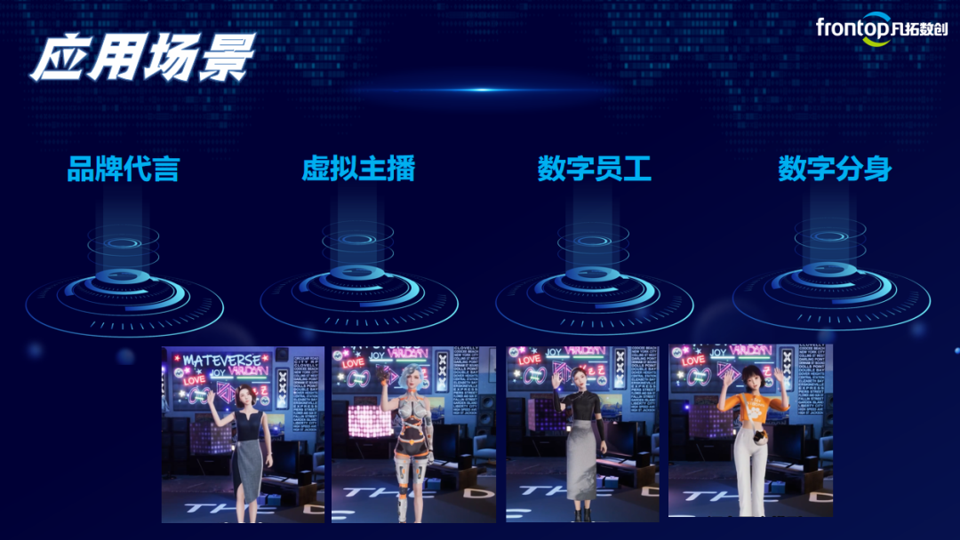 作為以人類模型為載體,與現實生活相互交融的數字人也同樣適用這三個屬性,我們將其引入到樹立數字人的思維中,便可以更好地分析數字人成長為數字IP的方法。作為一個合格的數字IP,擁有符合品牌需求、媒體傳播力和大眾審美的形象肯定必不可少的,不僅要有優秀的人物整體形象模塊,與其匹配的動作模擬、語音生成模塊也都是缺一不可。在應用場景中,良好的數字人形象可以有效地提升用戶的好感度,增加用戶與數字人互動的興趣,通過交互形成記憶點,來增加用戶將數字人與品牌相關聯的程度。戀愛時,人們常說“始于顏值、敬于才華、合于性格、終于人品”,對于數字人來說,在過了顏值這一關后,擁有豐富適合的人物設定才是拉近用戶與數字人距離、讓用戶產生好感的關鍵。首先便是樹立起與品牌文化正相關的價值觀,引起用戶共鳴的認同,加深對品牌的認知與好感。接著就是對數字人世界觀的打造,讓其形象包含了“真善美”等美好事物的向往,讓用戶感知品牌溫度、品牌社會責任感。進而就要給數字人嵌入相應的人物故事,讓數字人不像是剛剛“破殼而出”的新生兒,而更像是真真實實的人物,更能激發起用戶對于數字人的好奇與興趣,保持了解與探索欲。當品牌擁有獨立的數字人形象后,要想發揮出最大的效能,就應該讓數字人接管品牌的大部分推廣工作,包括TVC/短視頻/直播/線上發布會等,讓數字人頻繁地出現在品牌相關的各種曝光中,讓數字人形象代替品牌LOGO、標語等傳統二維元素來成為企業新的標志,讓用戶一想到品牌就聯想到數字人,一想到數字人就想到品牌。 當我們擁有了一個合格的數字人或者數字IP,那應該如何“物盡其用”地去發揮其最大的價值呢?在經過系統市場調查,梳理一些行業的痛點后提出了四大應用場景,他們分別是虛擬主播、品牌代言、數字員工、數字分身。