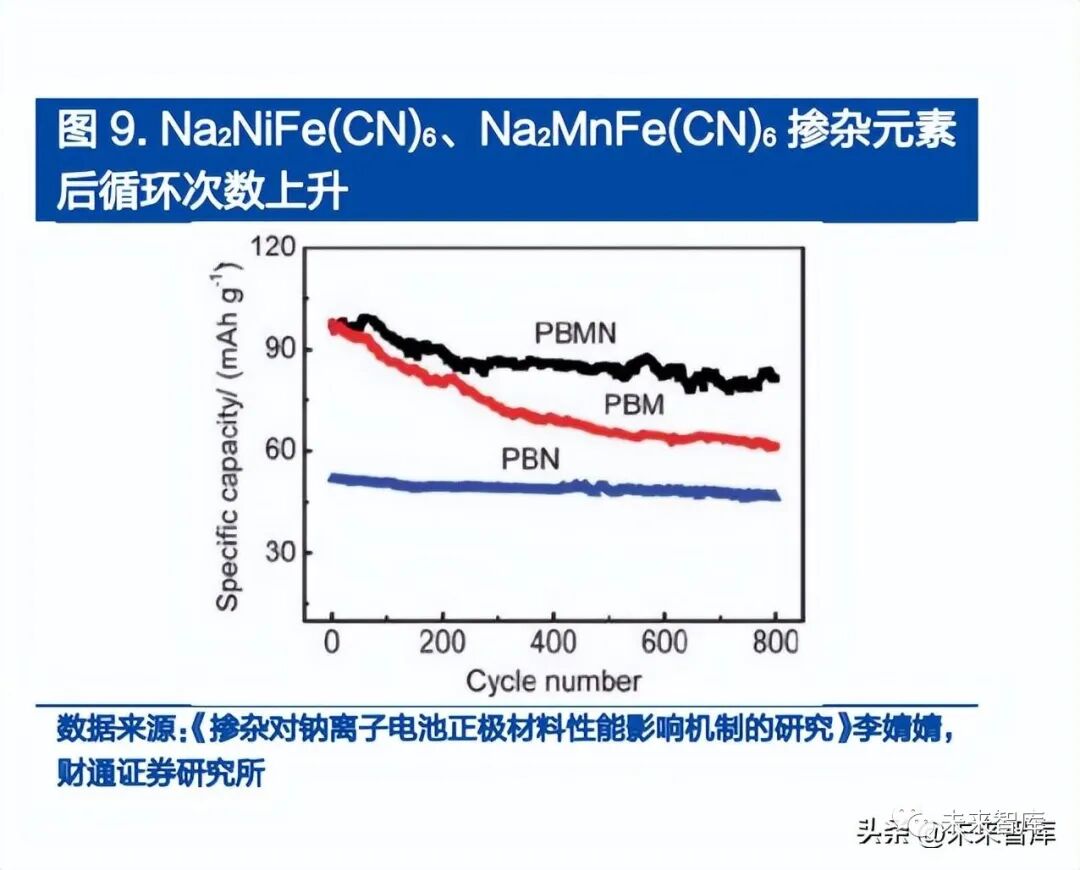 普魯士藍類化合物通過引入非活性金屬離子或設計不同結構等方法提升電化學 性能。普魯士藍類化合物用 AxMA[MB(CN)6]·zH2O 表示,其中 A 為堿金屬離子, MA 和 MB 為過渡金屬離子。其中過渡金屬離子與氰根形成六配位,形成較大的 三位多通道結構,有利于鈉離子的嵌脫反應,所以有較高的比能量。但是普魯士藍類化合物熱穩定性較差,電池工作過程中產生的熱量會使材料分解且材料制作 過程中形成的結晶水可能導致材料的晶格結構破壞造成安全問題。目前通過引入 非活性金屬離子或者設計不同的結構等方法可以保持材料的結構穩定性,提高電 化學性能。