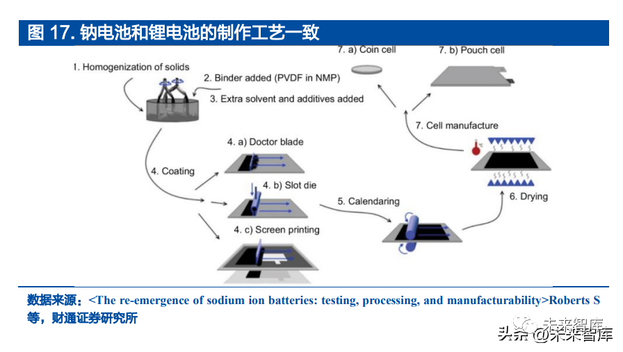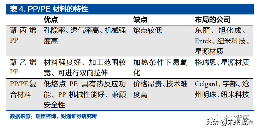 鈉電池的電解液和隔膜均具備成熟的量產技術。電解液在電池中起傳導離子的作 用,其中主要由溶劑、電解質和其他添加劑組成。鋰電池的電解質為六氟磷酸鋰, 而鈉電池的電解質為六氟磷酸鈉。隔膜主要起分隔電池正負極,防止兩極接觸而 短路的作用,并且隔膜還需要支持電解質離子通過,鈉電池和鋰電池均使用 PP 或者 PE 隔膜。