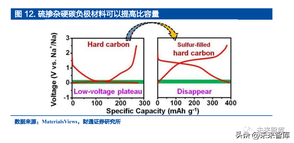 可以用作鈉電池負極的無定形碳主要分為硬碳和軟碳。其中在 2500°C 以上的高 溫下能石墨化的為軟碳,在 2500°C 以上的高溫下不易石墨化的為硬碳。無定形 碳儲鈉能力好、可逆比容量高、循環性能好,商業化趨勢明顯。同時軟碳和硬碳 都可以通過原子摻雜提高材料的層間距,制備納米結構碳材料縮短鈉離子擴散途 徑等方式提高電化學性能。