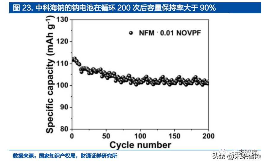 目前使用聚陰離子類化合物為正極材料的公司相對另外兩種材料而言較少。眾鈉 能源和高博能源使用釩基聚陰離子化合物作為電池的正極材料,廣州鵬輝科技公 司使用磷酸鹽類鈉正極做出了鈉離子電池樣品。其中眾鈉能源全體系電芯能量密 度為 120-160Wh/kg,循環性能可以達到 2000-10000 圈,且可以在零下 20℃正常 工作。基于以上分析可以知道鈉電池常用正極材料的特性。其中普魯士藍類化合物可逆 容量(120-140mAh/g)和比容量較高;聚陰離子類化合物材料能量密度、穩定性 和循環次數(2000 次)較高;層狀金屬氧化物全壽命周期成本較高。