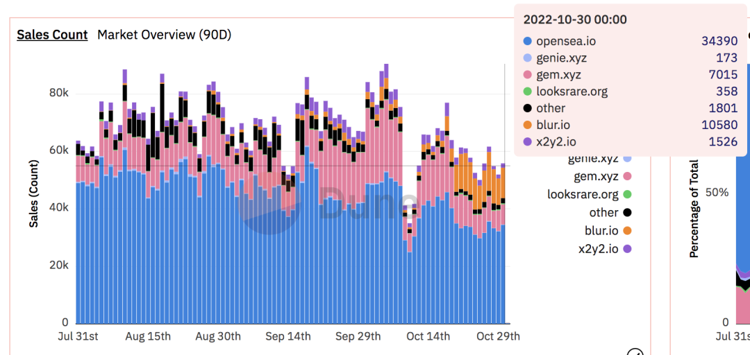 根據 sealaunch 提供的統計數據顯示,在過于一周,OpeaSea 平臺的交易量在整個以太坊 NFT 市場的占比份額已降低到 58 % 左右,與此同時, Blur 以及 LooksRare 這兩個平臺的市場占有率則有所上升。