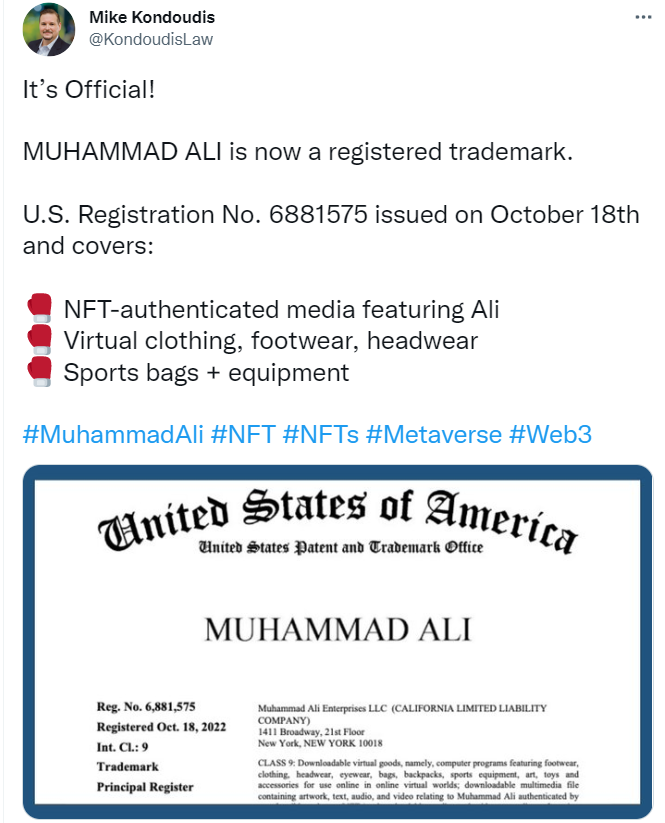 據 10 月 20 日消息,拳王阿里姓名“Muhammad Ali”已注冊為 NFT 和元宇宙商標,注冊公司為 Muhammad Ali Enterprises,注冊內容涵蓋以阿里為特色的 NFT 認證媒體、虛擬服裝、鞋類、頭飾、運動包和設備。